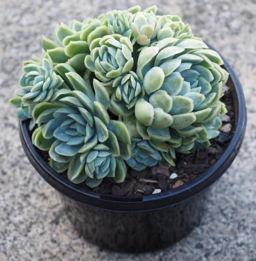 Leaves numerous, in cultivated specimens 80 - 100, in wild specimens fewer and smaller, in both forming a very compact rosette, very glaucous, of a pale bluish-green colour, very turgid, the margins translucent or in wild specimens reddish, 3 cm long in wild specimens, to 5 - 6 cm in cultivated specimens, 2.5 cm broad near the apex, rounded at apex, except the central ones, and these mucronate-tipped.