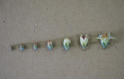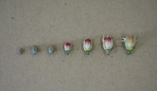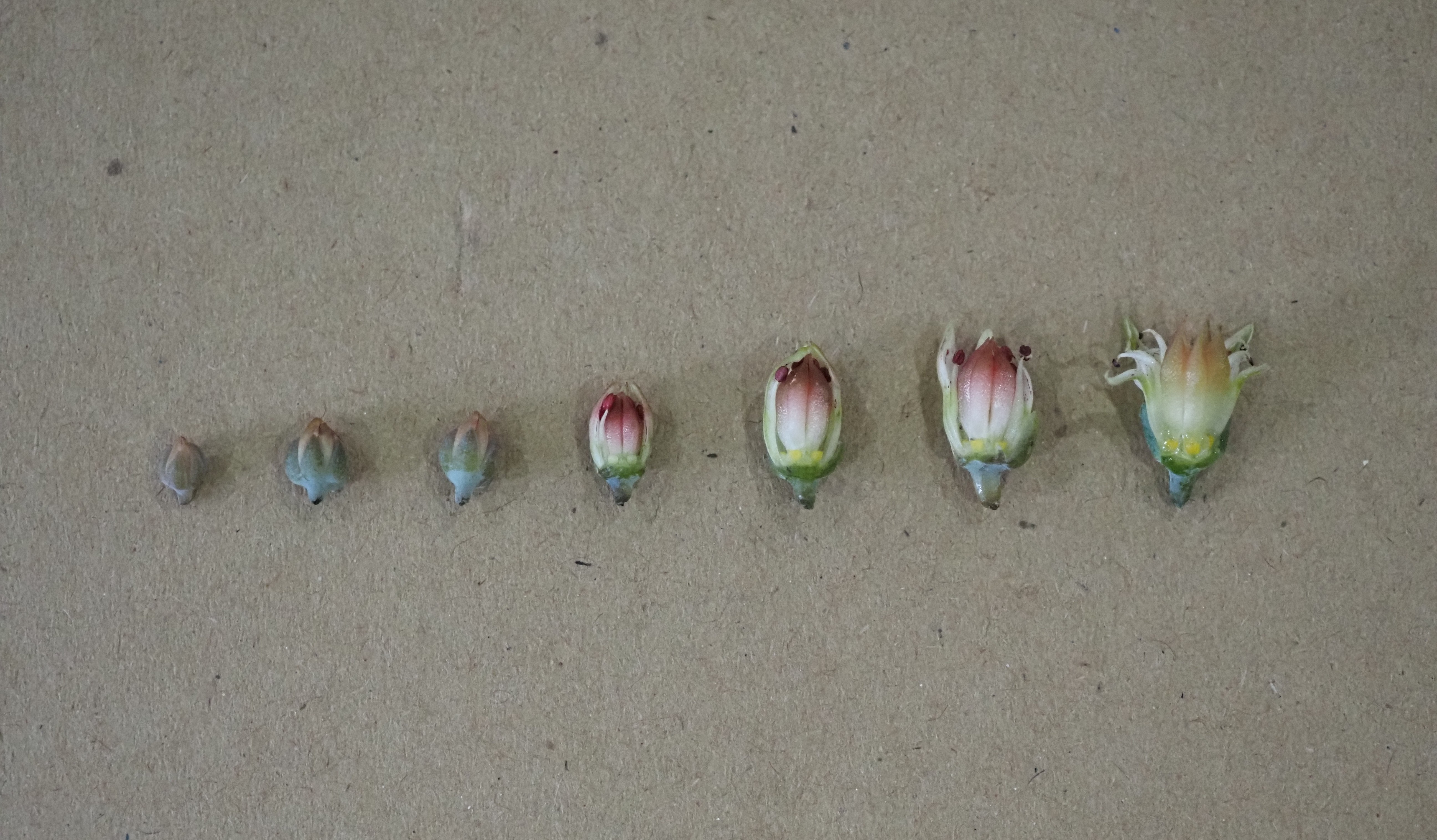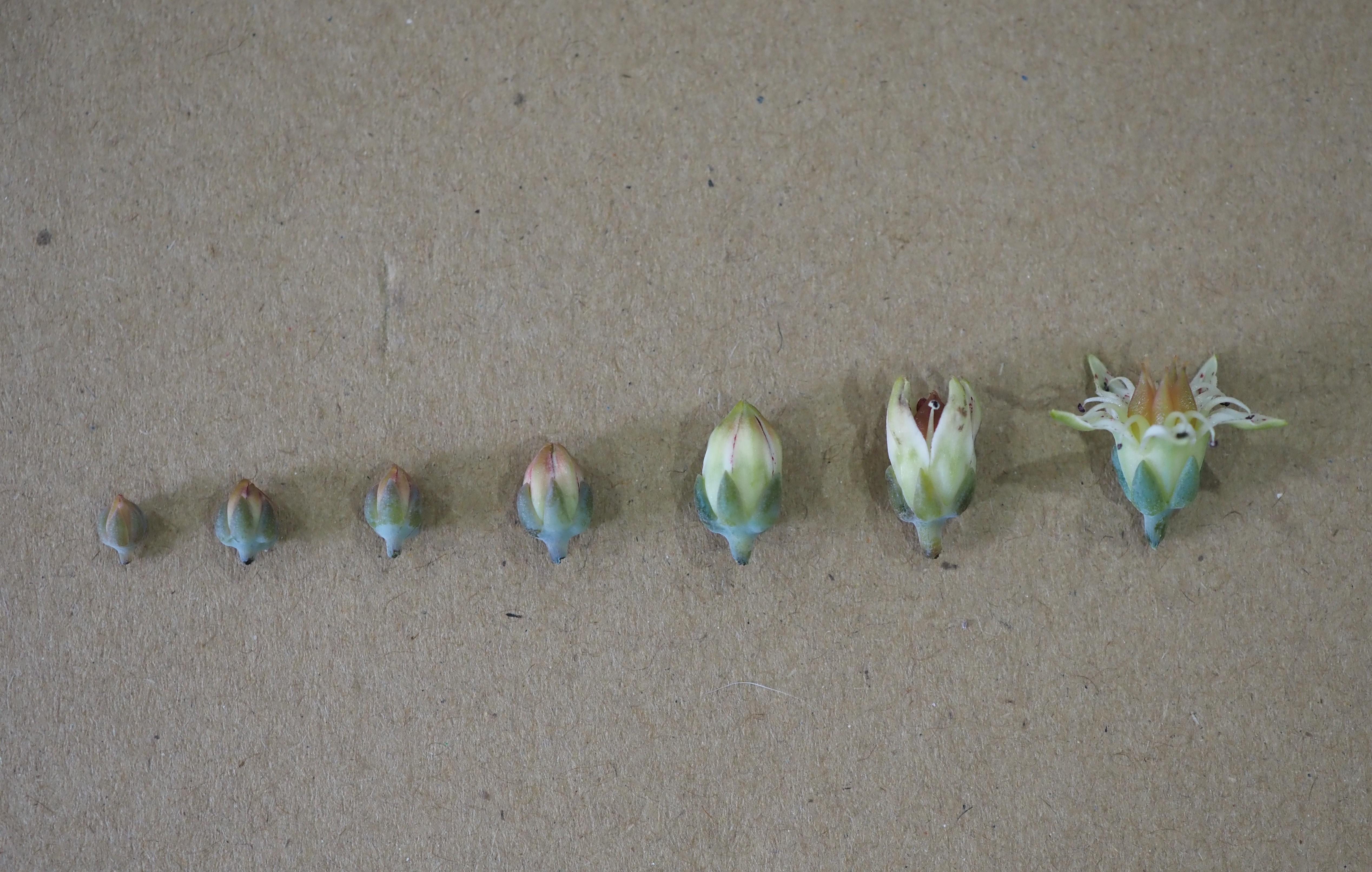 Inflorescence the same as in Graptopetalum paraguayense; petals white with some red dots different from flower to flower; anthers white, carpel greenish.