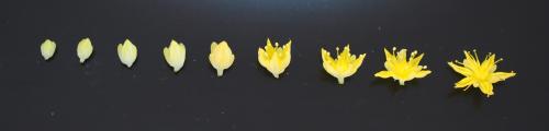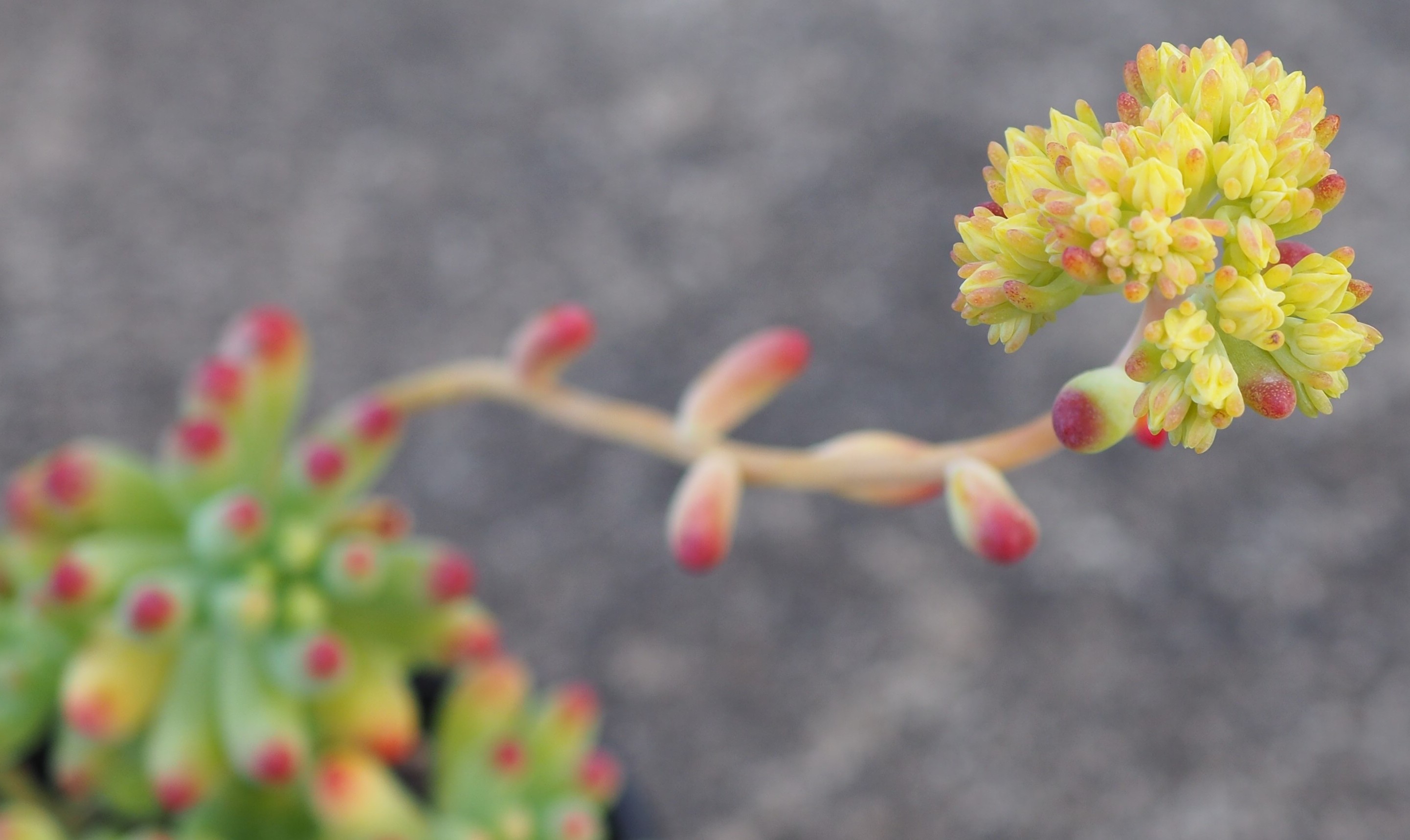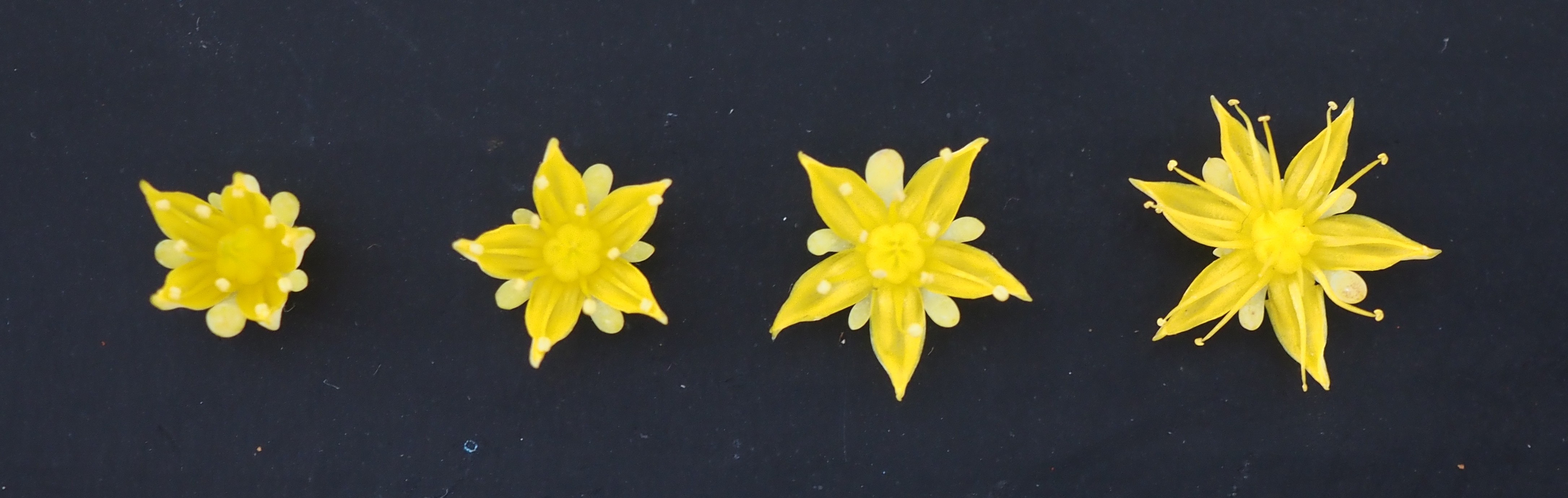 Flowers 5-merous, subsessile, sepals basally free, shortly spurred, unequal, clavately oblanceolate, obtuse, very thick in the upper part, 3.5 – 5 mm, petals free to the base, subovate, obtuse, broadly mucronate, yellow, 5 – 7 mm.