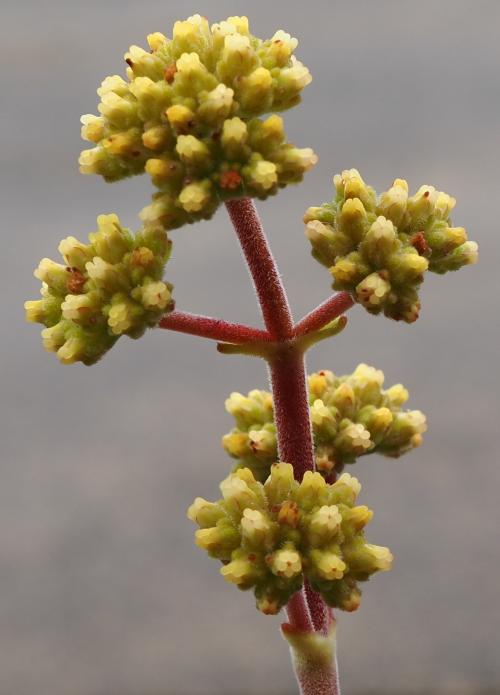 Inflorescence an elongate thyrse with many dense spherical part-inflorescences produced by 3 - 6 nodes of central axis, peduncle 15 – 30 (-45) cm long, hairy, 3 – 6 bracts without flowers, bracts on dichasia oblong-triangular.