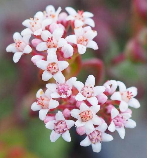 Flowers pedicellate, sepals triangular, ca. 1 mm long, acute, glabrous, fleshy, glaucous-green to reddish,petals oblong-elliptic, 3 – 4 mm long, apex rounded, with dorsal ridge, almost not appendaged, tips recurved, colour white, more or less pinkish to reddish, anthers brown, stigmas conspicuous.