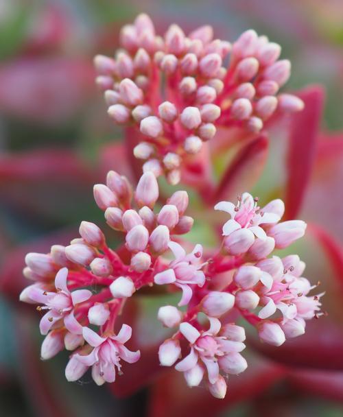 Fleurs pédicellées, sépales triangulaires, d'environ 1 mm de long, pointus, glabres, charnus, verts glauques à rougeâtres, pétales oblongs-elliptiques, 3 – 4 mm de long, apex arrondi, avec arête dorsale, presque pas d'appendice, pointe recourbée, blancs, plus ou moins rosés à rougeâtres, anthères marron, stigmates visibles.