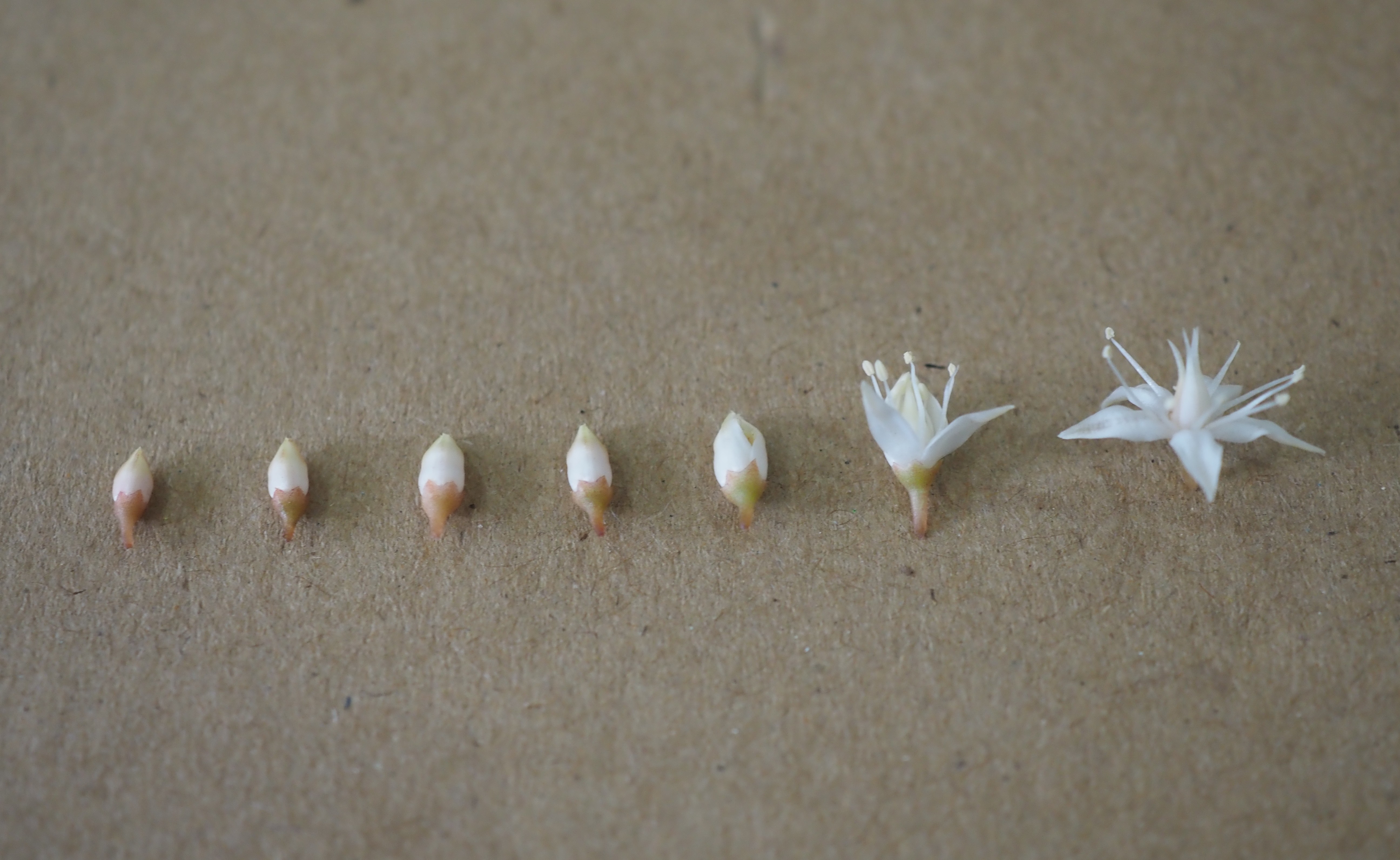 Flowers 5-merous, sepals broadly sessile, triangular-semiorbicular, apiculate, ± 1.5 x 1 mm, petals basally connate, oblong, tapering above, subobtuse, narrowly mucronate, white, ± 7.5 mm.