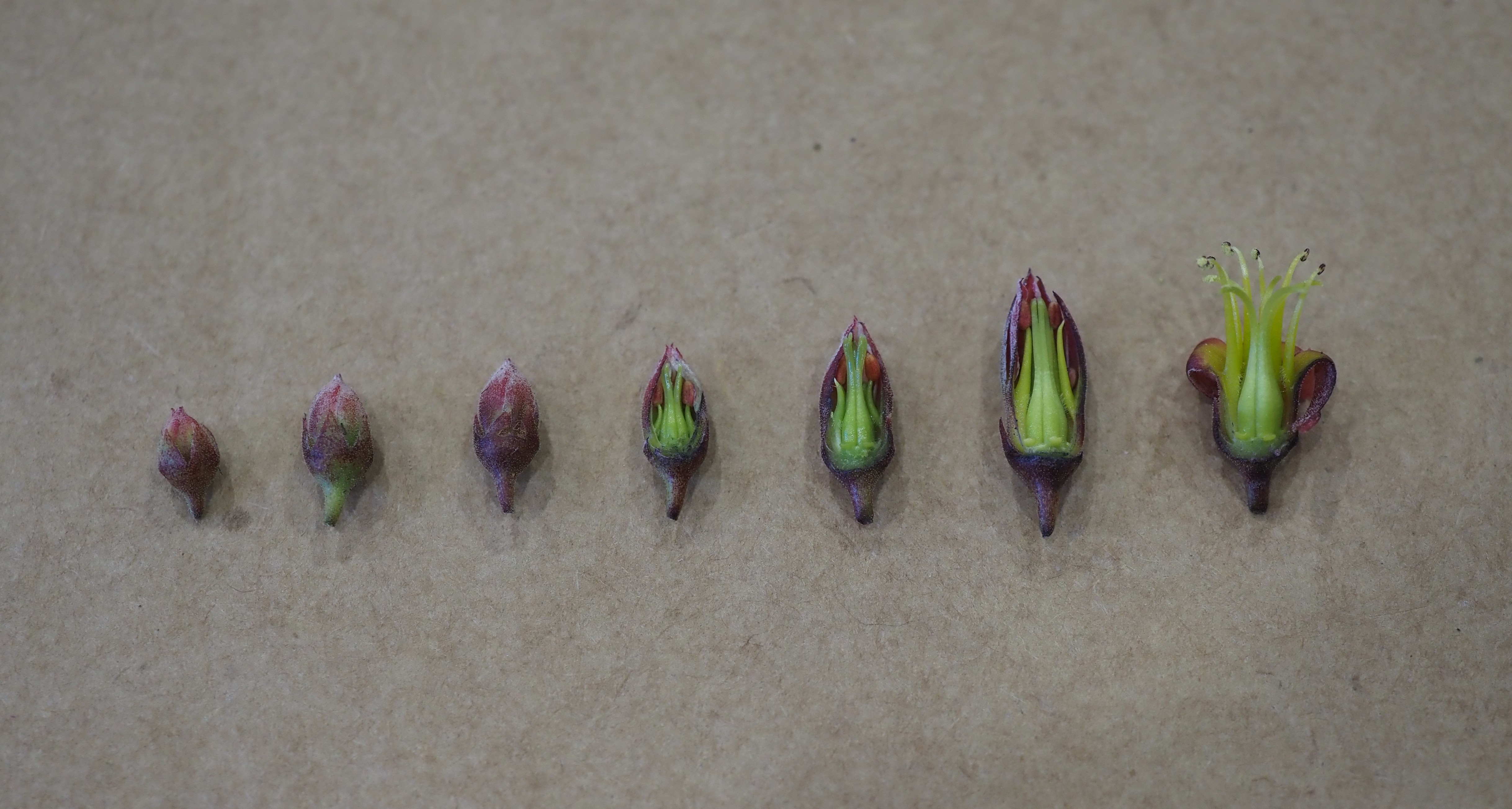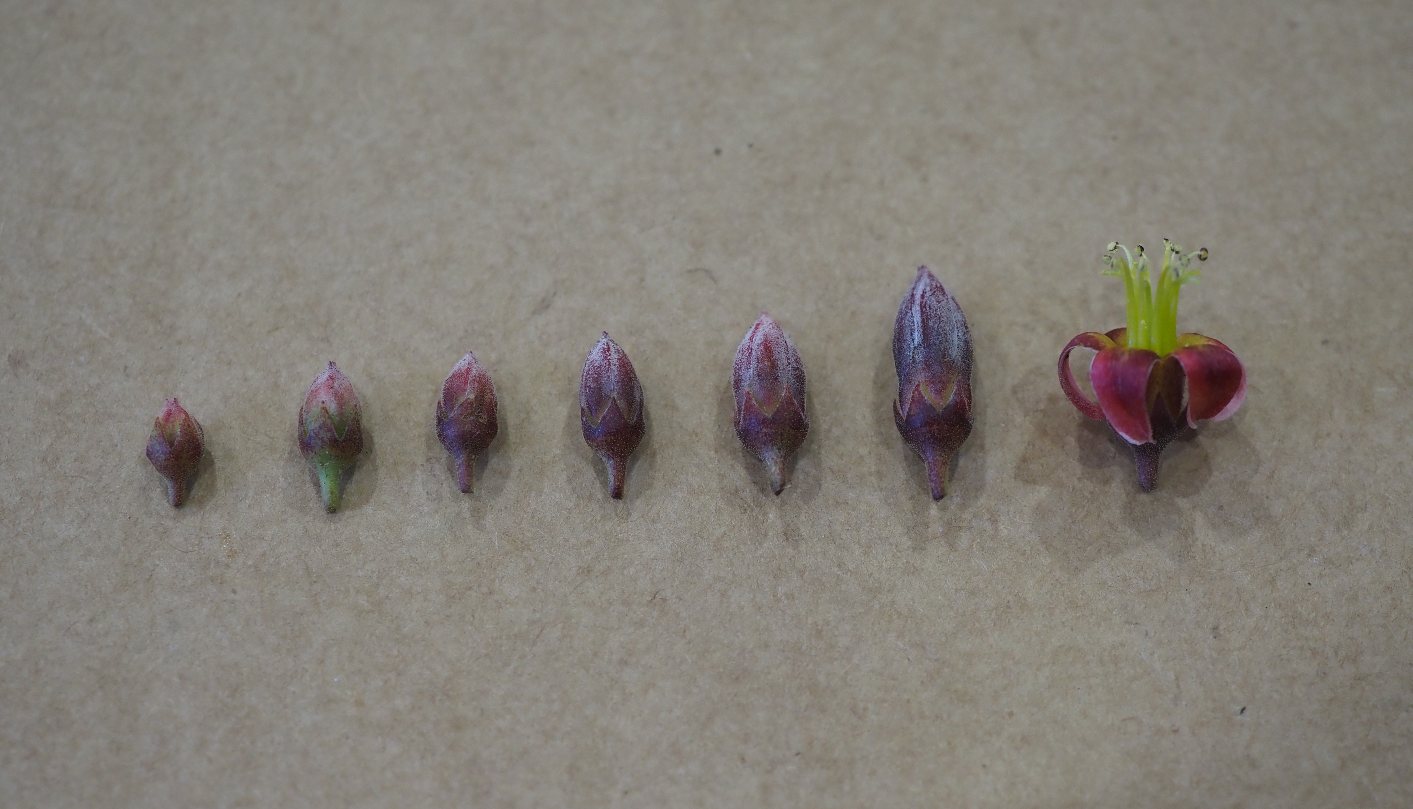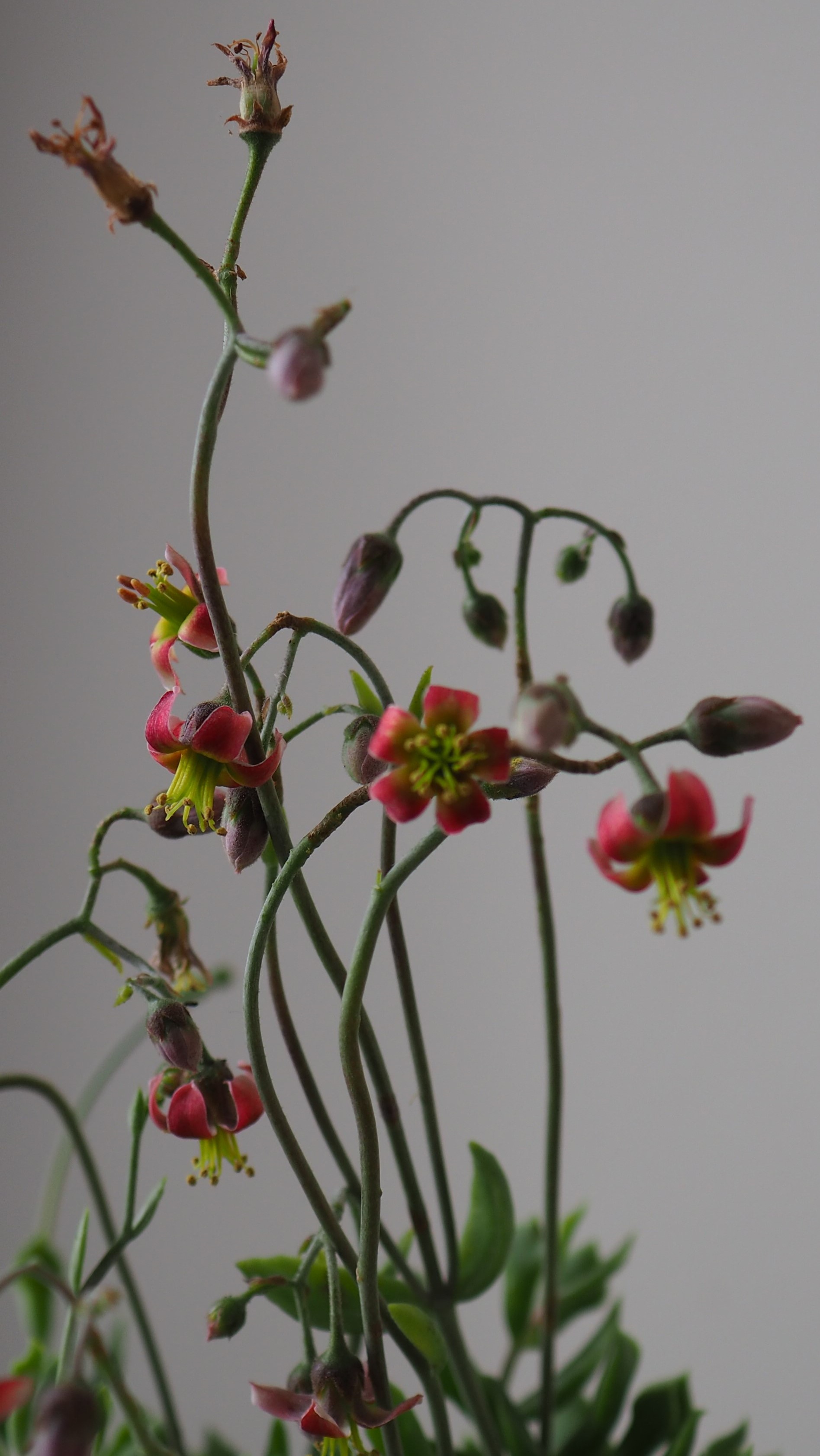 Inflorescence a thyrse, 10 – 25 cm tall with 1 – 3 dichasia, peduncle grey-green, to 3 mm in diameter at the base, pedicels 5 mm.