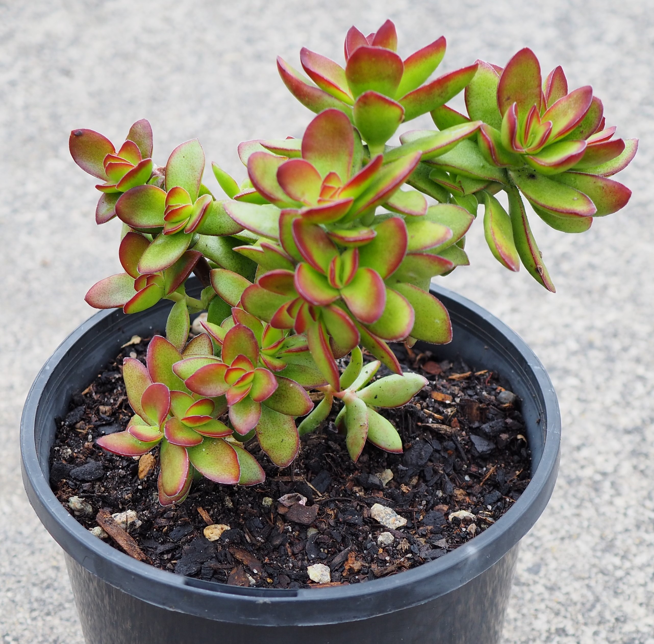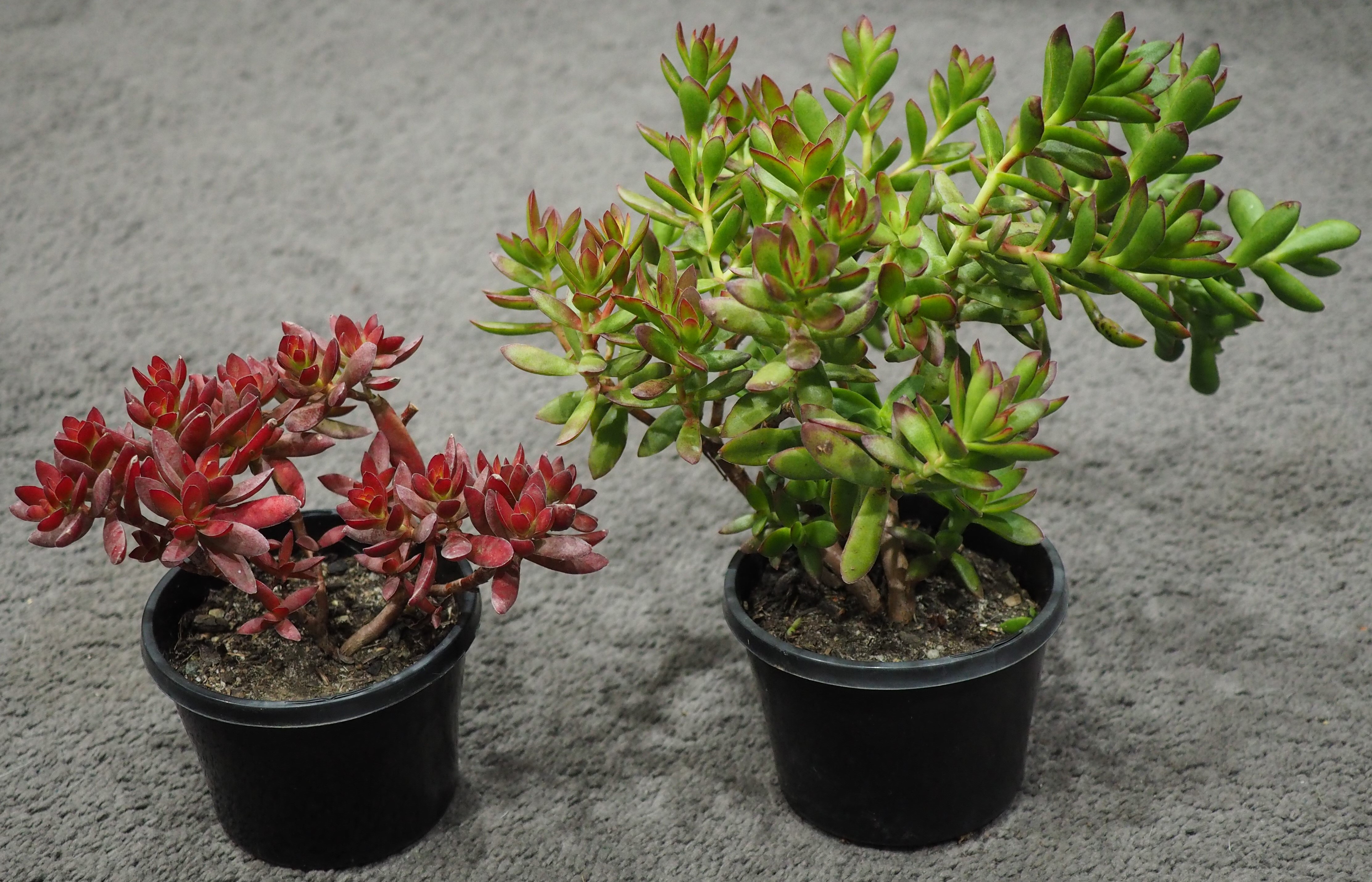 Crassula rubricaulis - plant at left grown in full sun all day, at right in morning sun only :