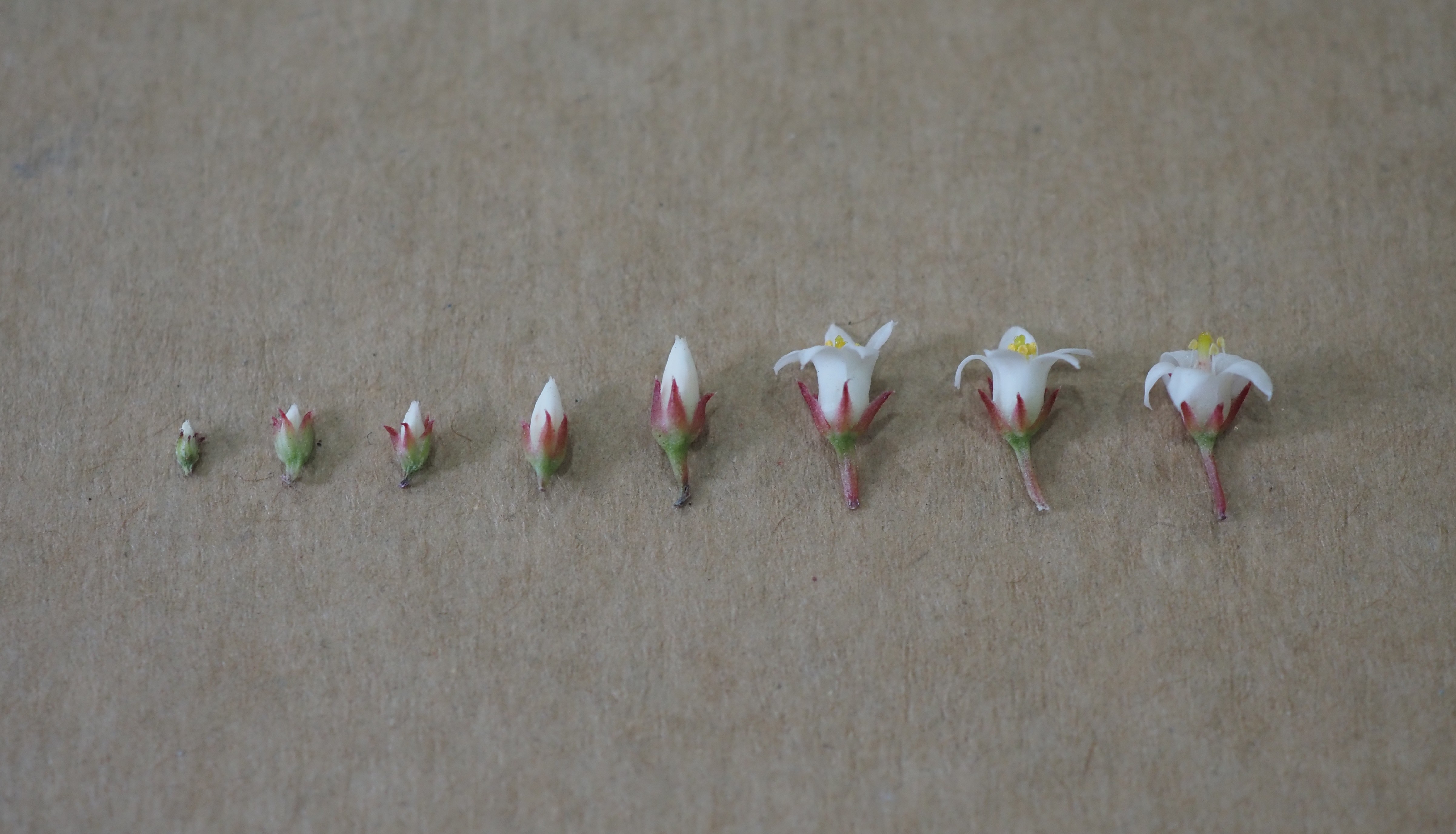 Fleurs : Sépales triangulaires, 2,5 – 3 mm de long, brusquement aigus, souvent munis de dents le long des marges, charnus, verts à rouges, corolle tubulaire, blanche, en étoile, de 7 mm de diamètre, pétales 4 – 5,5 mm de long, oblongs-ovales, brièvement soudés à la base, avec appendice dorsal presque en position terminale, plus ou moins recourbés par la suite, étamines avec anthères jaunes.