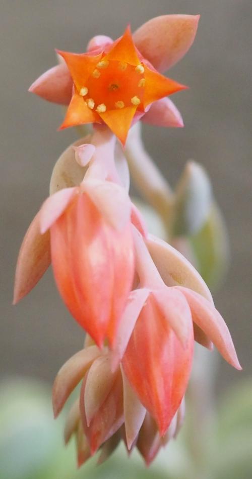 Fleurs : Sépales droits, écartés, jusqu'à 11 mm de long, corolle pentagonale, 19 – 20 x 10 mm de diamètre, écarlate.