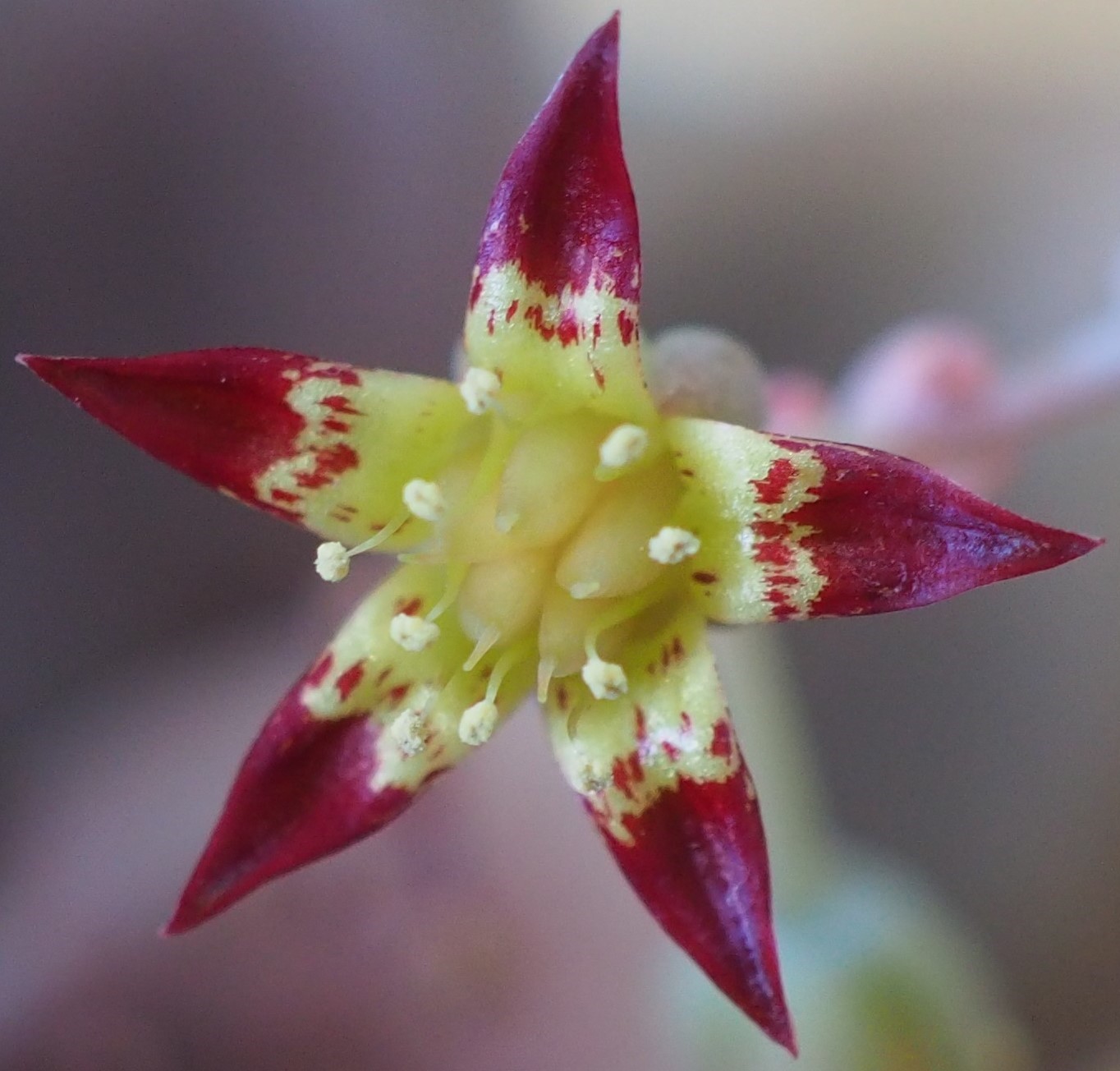 Flowers 5-merous, calyx 5 – 6 mm in diameter, sepals ovate, acute, almost equal, 2,5 – 4 x 1,5 – 3 mm, corolla 15 – 18 mm in diameter, petals 10 – 11 mm, pale whitish-yellow to pale yellow, tube campanulate, 3,5 – 4 x 5 – 6 mm, lobes triangular-lanceolate, acute, 6 – 7 x 3 – 3,5 mm, upper face with red cross-bands, apically almost entirely red, filaments pale yellow.